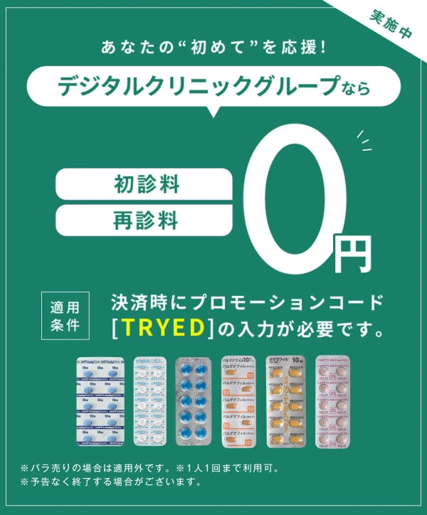 | 診察料 | 初診料:1,650円 ※決済時にプロモーションコード「TRYED」の入力で0円に |