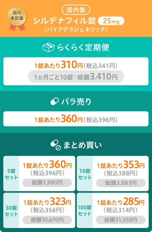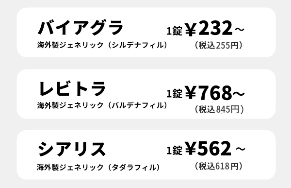 バイアグラジェネリック25mgが1錠あたり246円(税込)の値段は業界トップクラスの安さです。