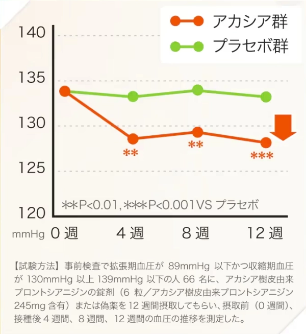 本品にはアカシア樹皮由来プロアントシアニジンが含まれるので、収縮期血圧が高めの方の高めの血圧(収縮期血圧)を下げる機能があります。本品にはアカシア樹皮由来プロアントシアニジンが含まれるので、空腹時血糖値が高めの方の高めの血糖値(空腹時血糖値)を下げる機能があります。