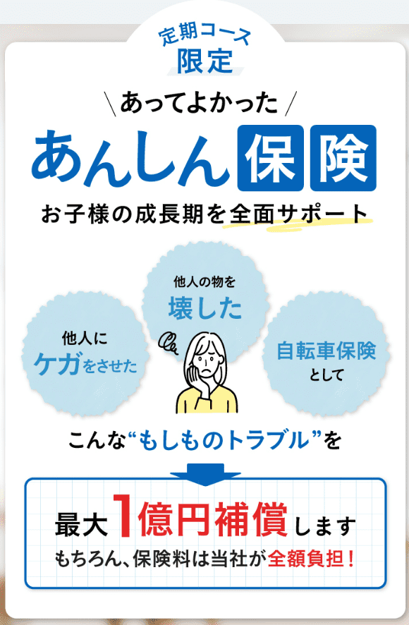 【あんしん保険】…定期コース限定で、お子様の成長をサポートしてくれる保険に加入してくれます!(※保険料は全額サンテミナ㈱負担)