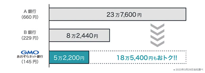 日々の振込手数料が少し違うだけで、年間では大きな差になっていきます。これが、5年後、10年後・・・となっていくとさらに10倍以上の差になっていく訳です。