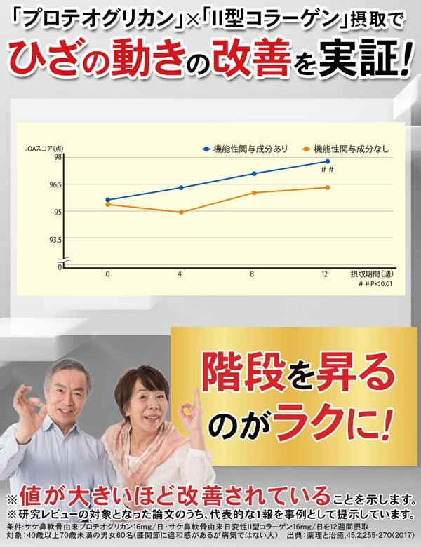 本品に含まれるサケ鼻軟骨由来プロテオグリカン・サケ鼻軟骨由来非変性Ⅱ型コラーゲンは、ひざ関節に違和感のある健常な中高年の立ち上がる・長く歩く・階段の昇り降り等のひざの曲げ伸ばしの改善をサポートする機能が報告されています。