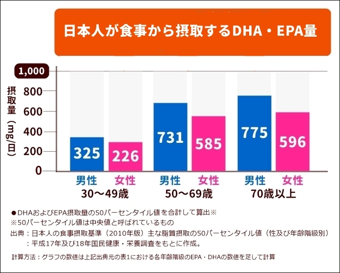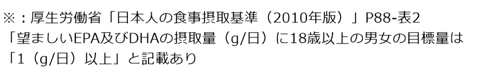 また、30歳以上の健康な日本人における、DHA・EPAの一日の目標摂取量が1,000mg※1なのに対し、実際の摂取量はまだまだ不足!