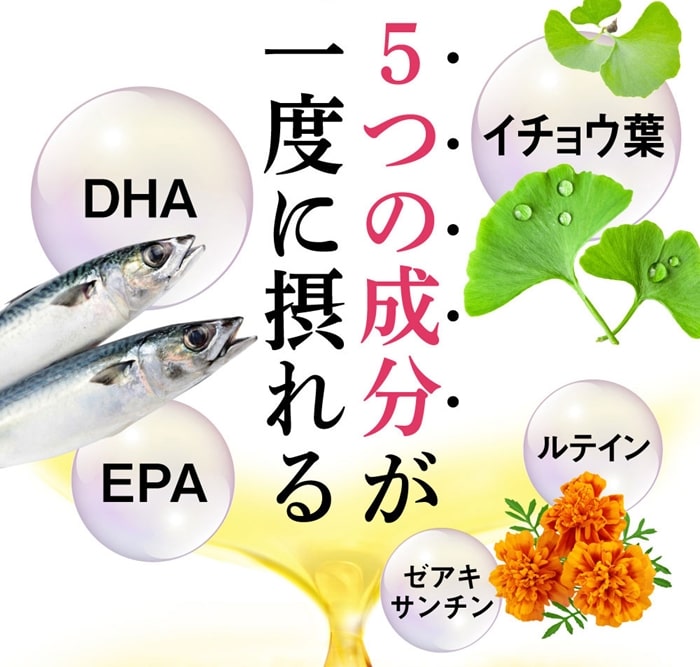 DHA・EPAやイチョウ葉エキス、ルテイン、ゼアキサンチンなど、サプリの主役級の成分を5つも贅沢に配合しています。