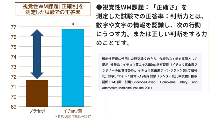 臨床試験の結果、イチョウ葉エキスを摂取したグループは判断力の正確さ※が向上しています。