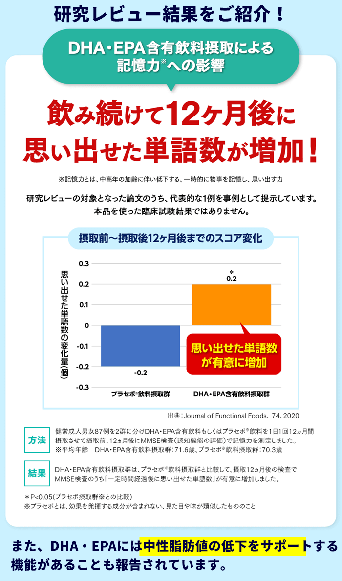 DHA/EPAの研究報告より、中高年の方の加齢に伴い低下する、認知機能の一部である記憶力を維持することが報告されています。