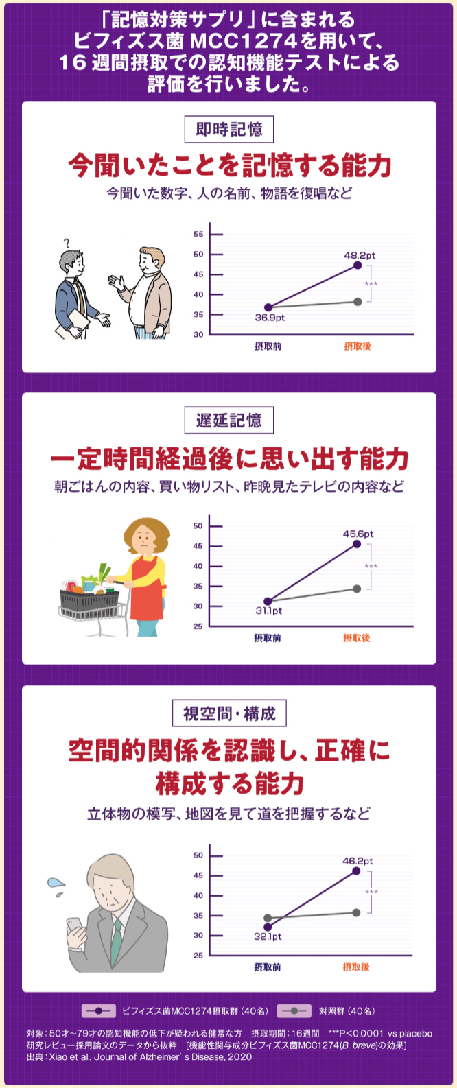 実際に50才~79才の認知機能の低下が疑われる健康な方40名を対象にした認知機能テストで16週間ビフィズス菌MCC1274を摂取したところ、