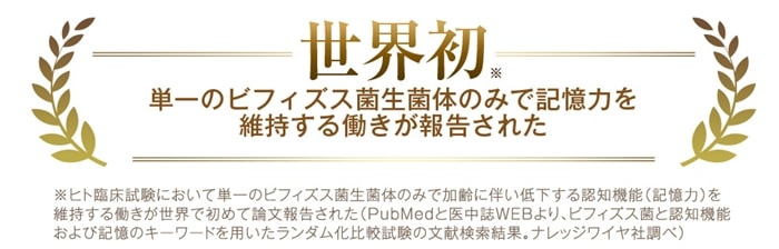 ※2:ヒト臨床試験において単一のビフィズス菌生菌体のみで加齢に伴い低下する認知機能(記憶力)を維持する働きが世界で初めて論文報告された