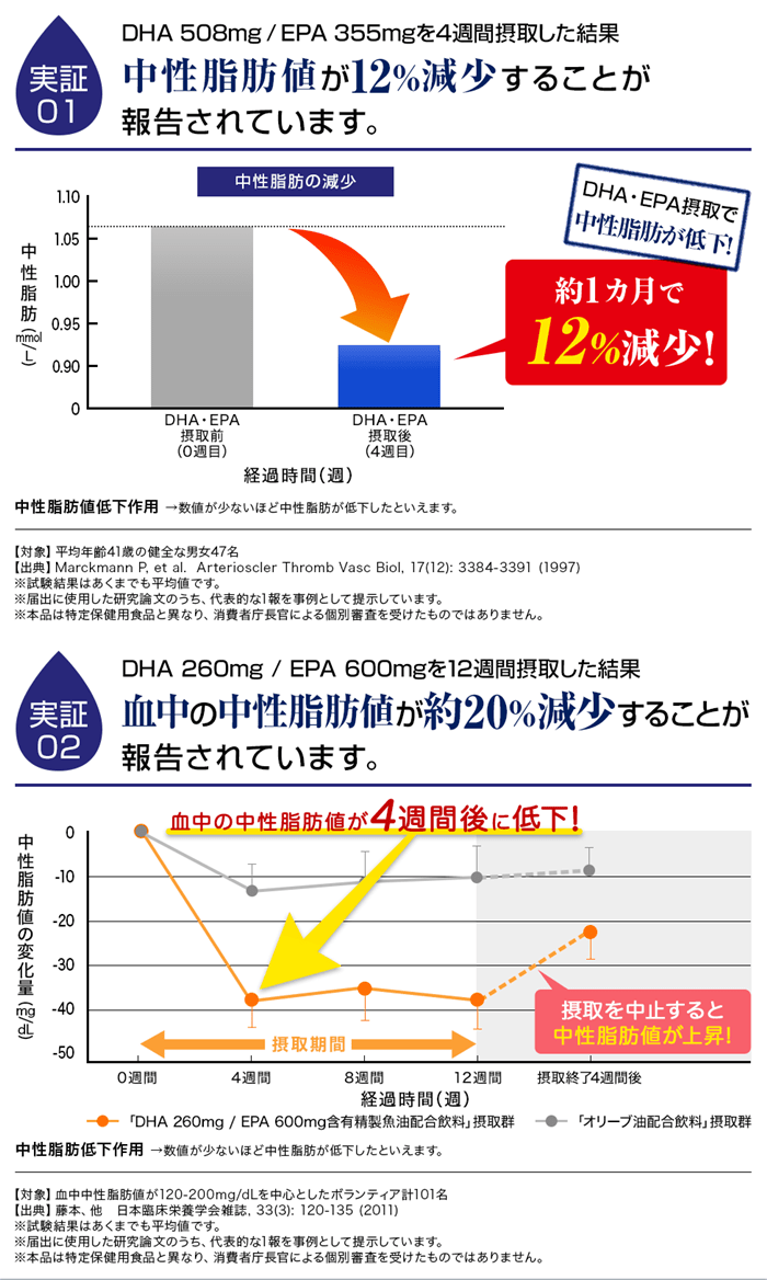 DHA・EPAには中性脂肪を低下させる機能があることが報告されています。