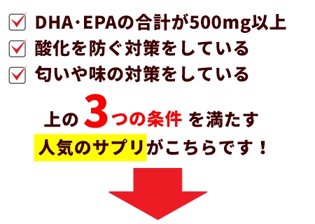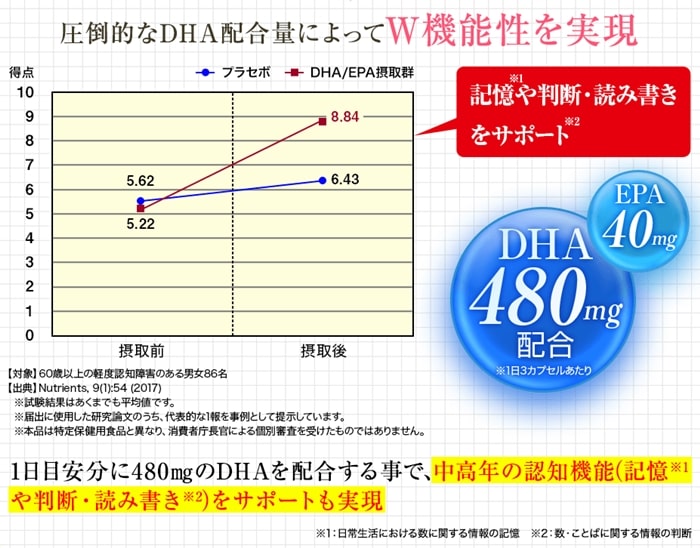 1日目安分3粒あたり、DHA480mg、EPA40mgを配合しています。