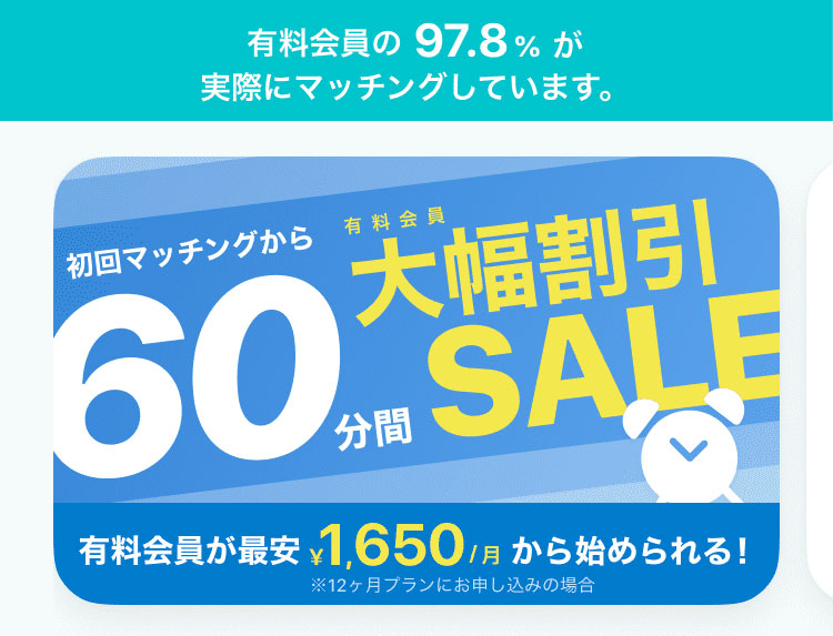 | 男性料金 | 4,800円(税込)/月~ ※登録・マッチングまでは無料! |