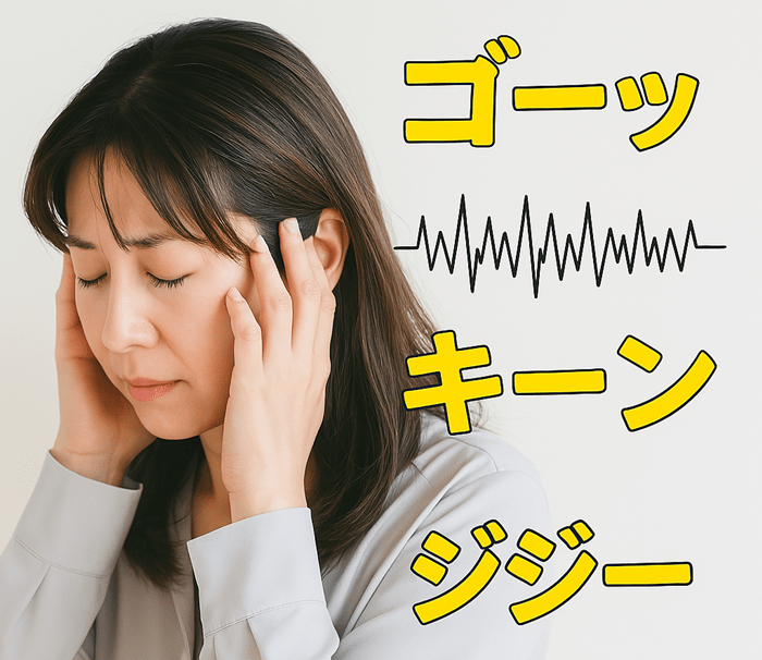 「キーン」「ジー」「ピー」「ザー」「ゴー」などの雑音や、「ドクドク」と心臓の動きと一致する音などが聞こえたりします。