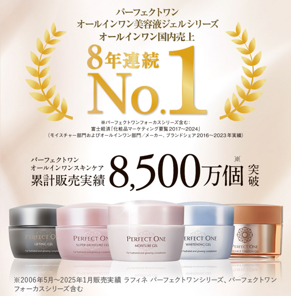 ※2 パーフェクトワン オールインワン美容液ジェルシリーズ累計販売実績2006年5月~2025年1月(ラフィネパーフェクトワンシリーズ、パーフェクトワンフォーカスシリーズ含む)