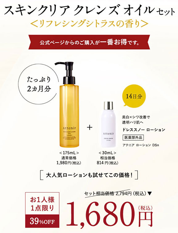 公式サイト限定、お一人様一点限り、「スキンクリア クレンズ オイル本品(2ヶ月分)」と「ドレススノー ローション【医薬部外品】(14日分)」がセットで1,680円(税込)で体験できます!気になった方はぜひ、まずはお得なセットで体験してみてください♪