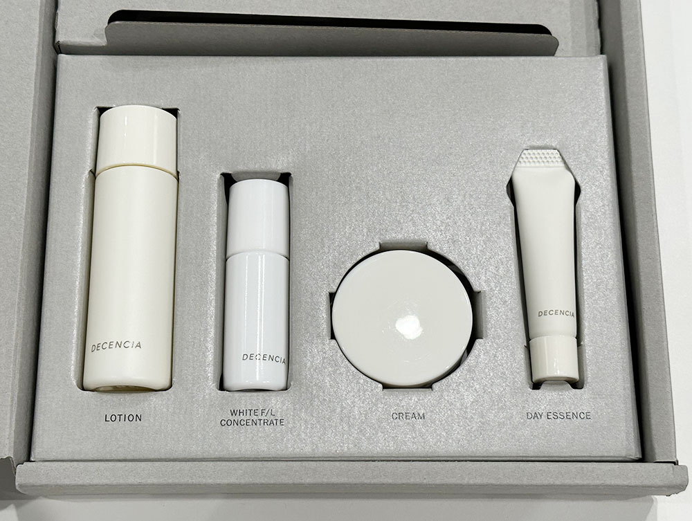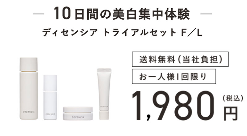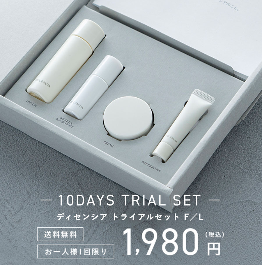 ディセンシアのトライアルセット F/Lは化粧水、美白※美容液、クリーム、日中用美容液の4種類のセットで約10日間お試しできます。