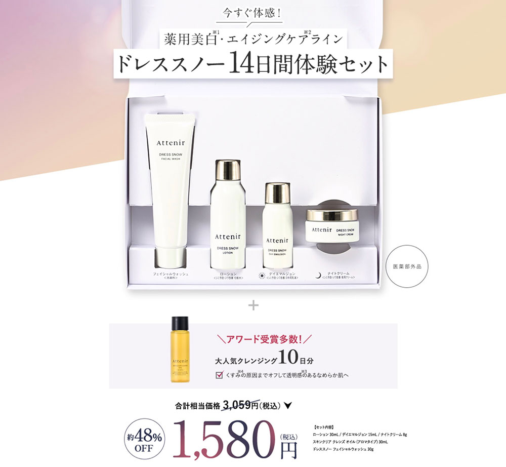 ドレススノーは公式サイト限定で14日間のトライアルセットを1,580円(税込)でお試しできます。