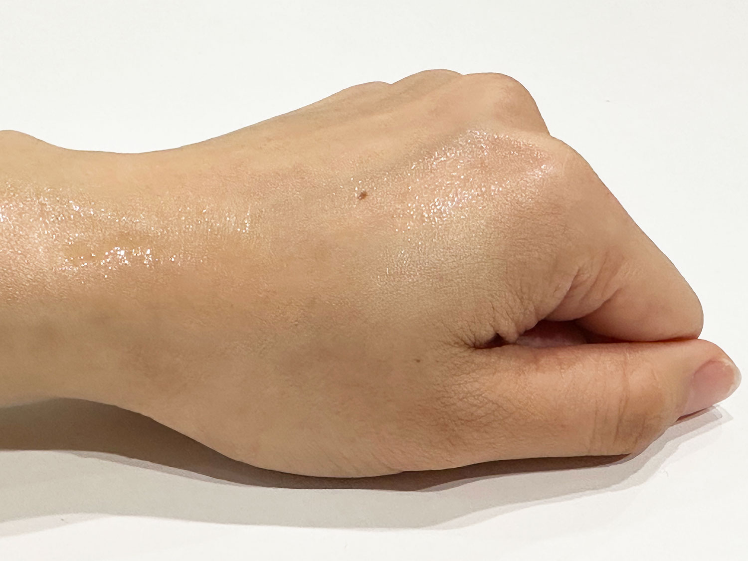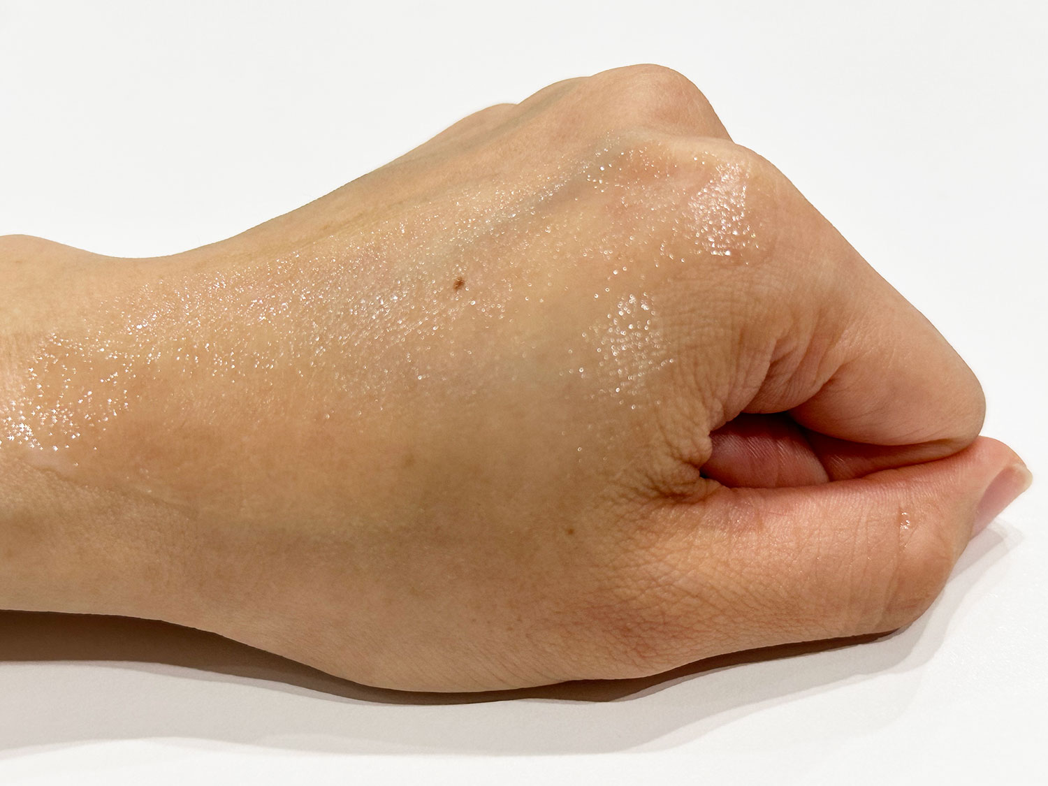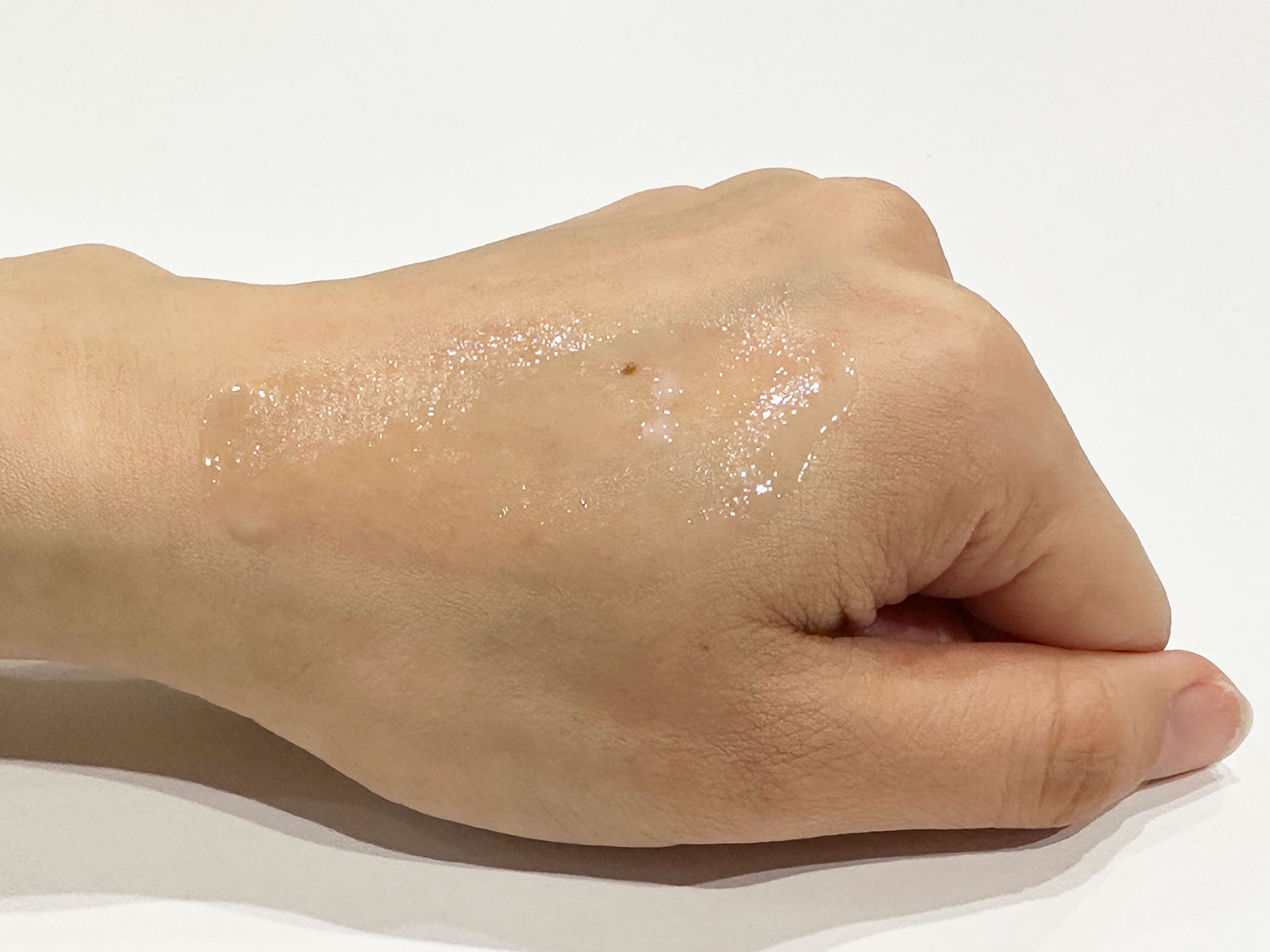 透明でみずみずしいテクスチャーで、シャバっとした使用感です。 ベタつきは感じず、軽い付け心地でさらさらとした仕上がりです。