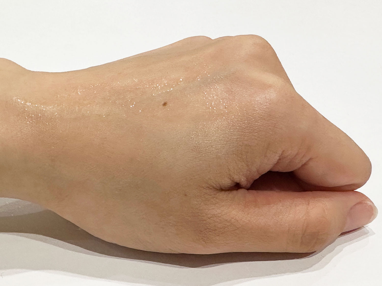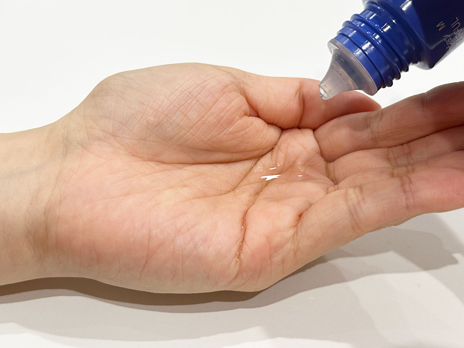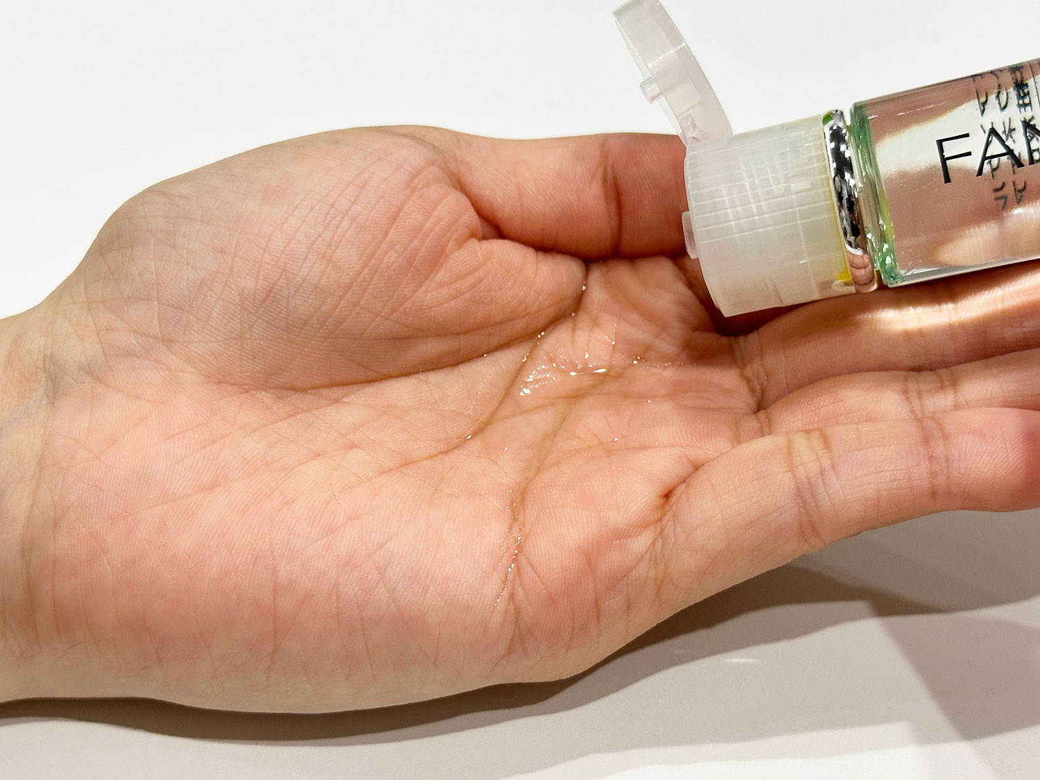 透明でみずみずしいテクスチャーで、シャバっとした使用感です。 ベタつきは感じず、軽い付け心地でさらさらとした仕上がりです。