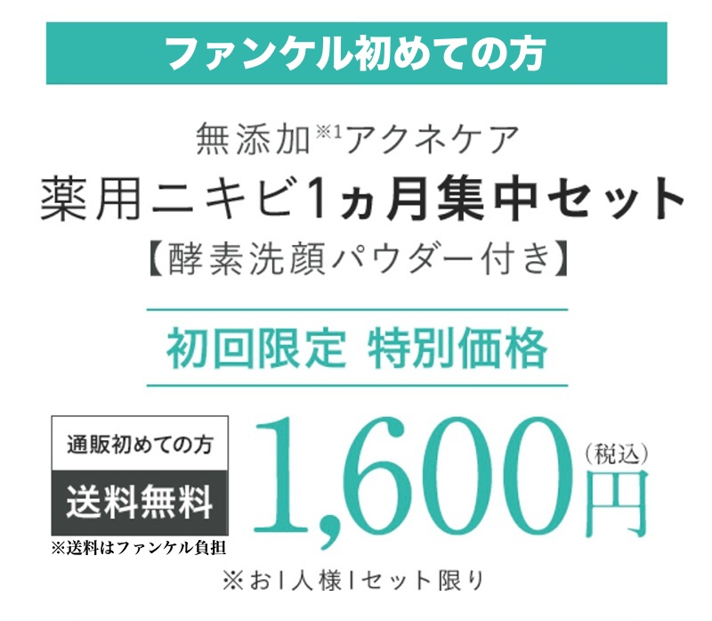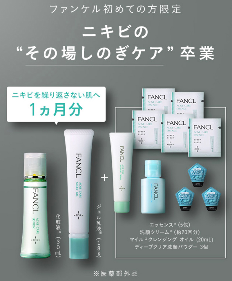 FANCL アクネケアは1カ月分のトライアルセットが1,600円(税込)でお試しできます。