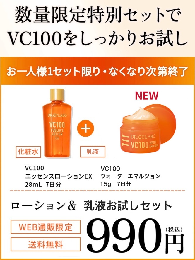 今なら!公式サイト限定で「VC100 エッセンスローションEX」と「VC100ウォーターエマルジョン ミニ」を990円(税込)でお試しできます!