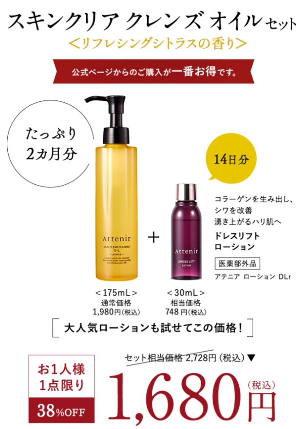 公式サイト限定、お一人様一点限り、「スキンクリア クレンズ オイル本品(2ヶ月分)」と「ドレスリフト ローション【医薬部外品】(14日分)」がセットで1,680円(税込)で体験できます!気になった方はぜひ、まずはお得なセットで体験してみてください♪
