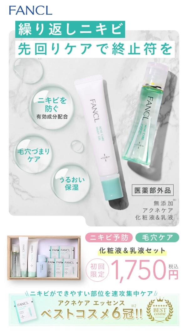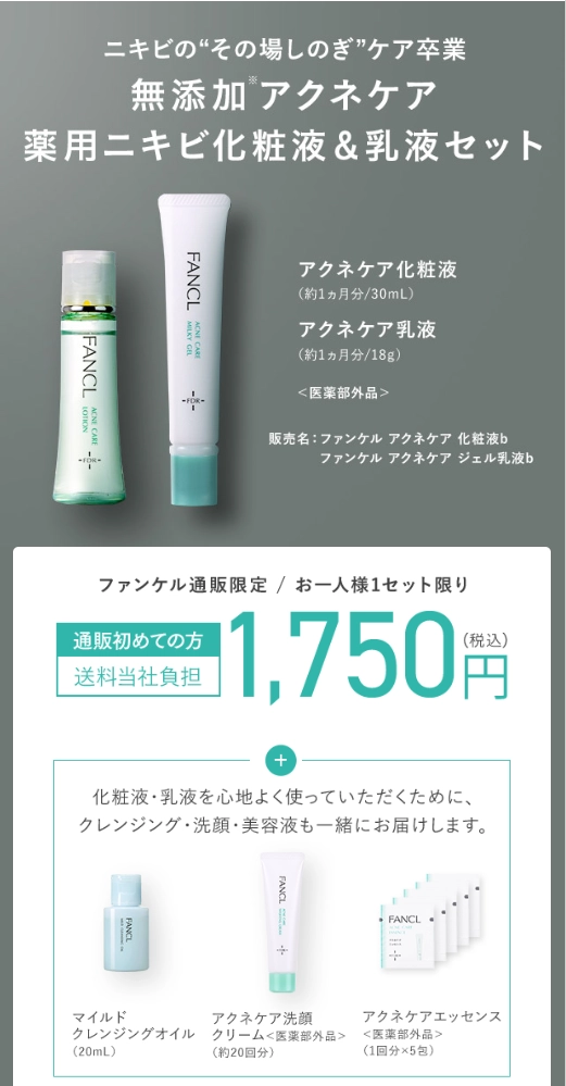 FANCL アクネケアは1カ月分のトライアルセットが1,750円(税込)でお試しできます。